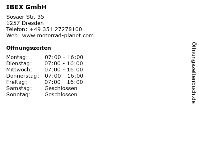 | Öffnungszeiten IBEX GmbH in Dresden anzeigen | |
