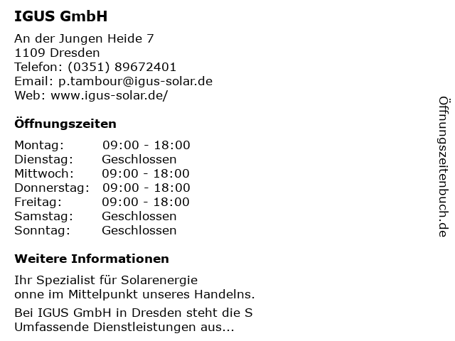 | Öffnungszeiten IGUS GmbH in Dresden anzeigen | |
