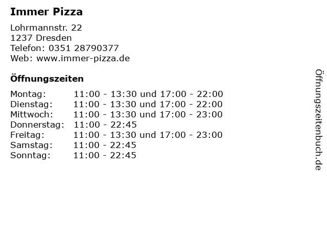 | Öffnungszeiten Immer Pizza in Dresden anzeigen | |