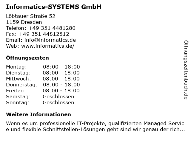 | Öffnungszeiten Informatics-SYSTEMS GmbH in Dresden anzeigen | |