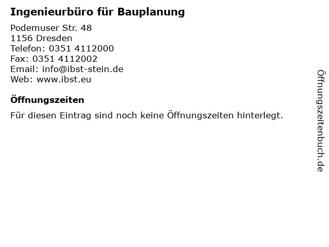 | Öffnungszeiten Ingenieurbüro für Bauplanung in Dresden anzeigen | |