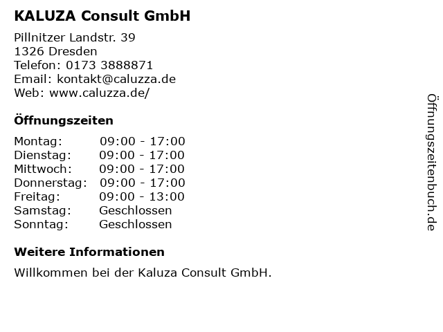 | Öffnungszeiten KALUZA Consult GmbH in Dresden anzeigen | |