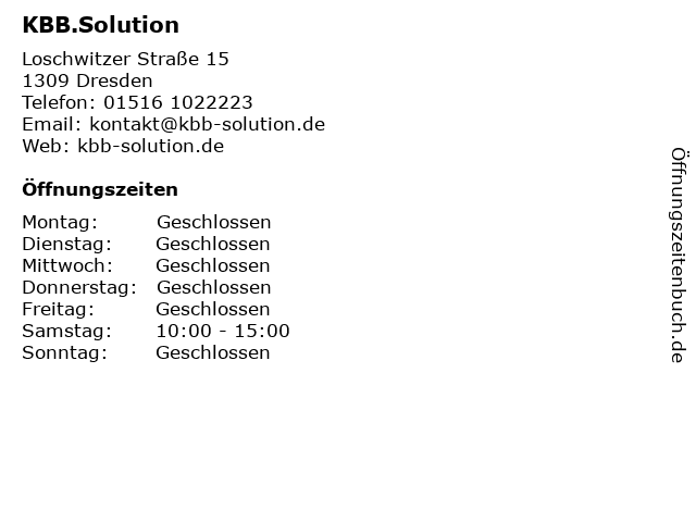 | Öffnungszeiten KBB.Solution in Dresden anzeigen | |