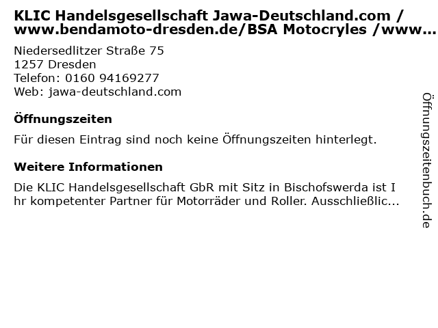 | KLIC Handelsgesellschaft Jawa-Deutschland.com / www.bendamoto-dresden.de/BSA Motocryles /www.royalalloy-dresden.de anrufen | |