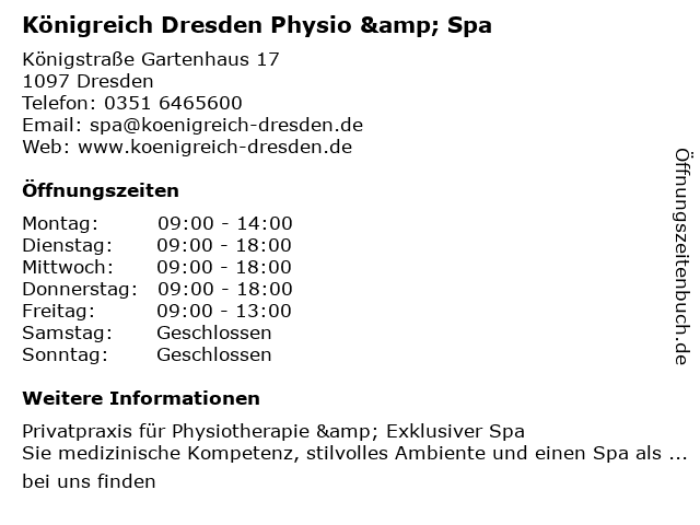 Branchen & Suchbegriffe zu Königreich Dresden Physio & Spa:königreich, massagezentrum, physio, physiotherapie, spa, wellness |