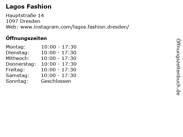 | Öffnungszeiten Lagos Fashion in Dresden anzeigen | |