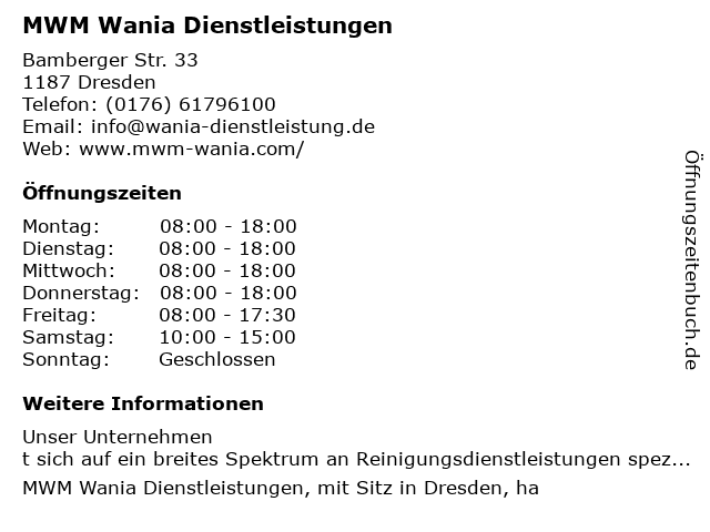 Öffnungszeiten MWM Wania Dienstleistungen in Dresden anzeigen | |