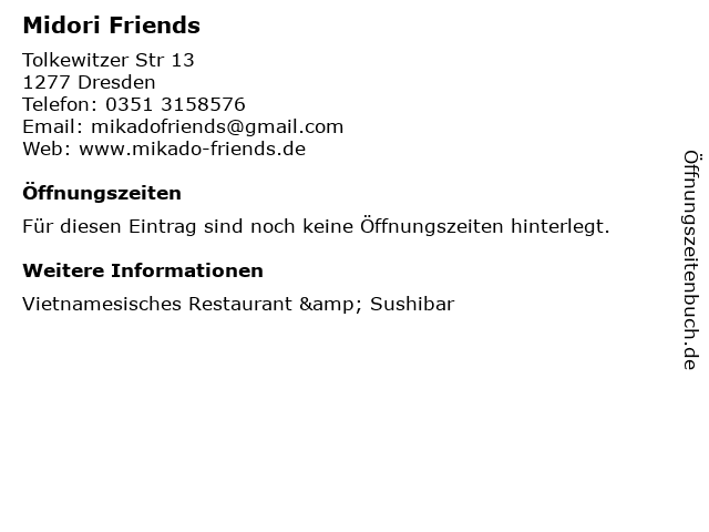 | Öffnungszeiten Midori Friends in Dresden anzeigen | |