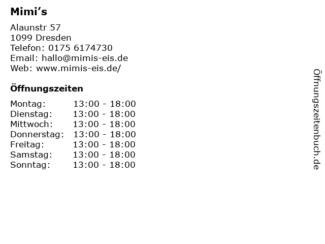 | Öffnungszeiten Mimi’s in Dresden anzeigen | |