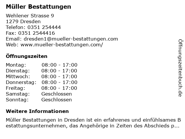 | Öffnungszeiten Müller Bestattungen in Dresden anzeigen | |