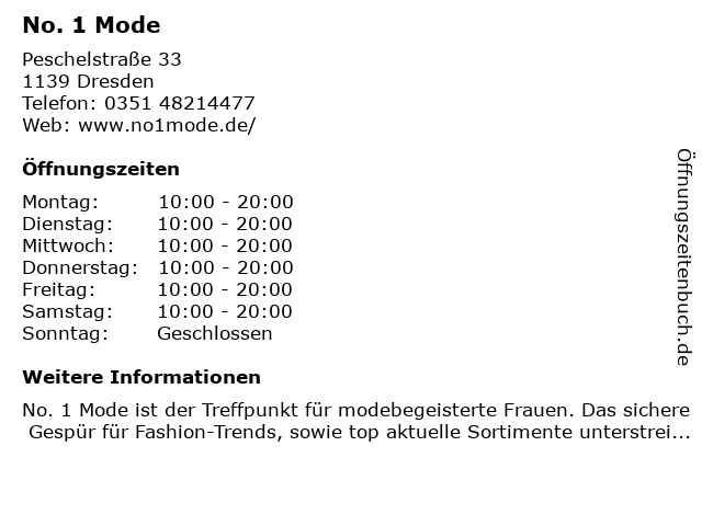 | Öffnungszeiten No. 1 Mode in Dresden anzeigen | |