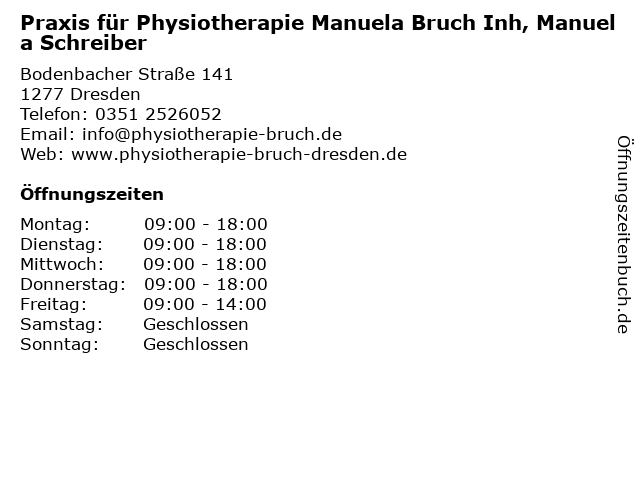 2 Manuela Bruch Physiotherapie, Inhaberin Manuela Schreiber (Entfernung: 0,01 km) Bodenbacher Str. 141, 01277 Dresden 6 |
