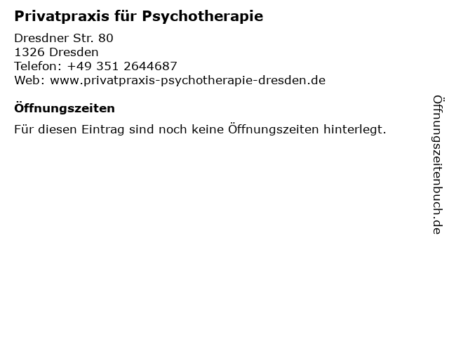 1 Privatpraxis für ganzheitliche Schmerztherapie Dipl.-Med. Hjalmar Baldauf (Entfernung: 5,91 km) Schandauer Straße 43, 01277 Dresden 2 Toralf Möbius - Privatpraxis für Orthopädie, Osteopathie und manuelle Medizin bei Kindern (Entfernung: 6,69 km) Bautzner Landstraße 5, 01324 Dresden 3 Dipl.-Psych. F. Thomas Privatpraxis für Psychotherapie (Entfernung: 7,78 km) Mary-Krebs-Str. 1, 01219 Dresden 4 Dipl.-Psych. Klaus Schütz - Psychologische Privatpraxis am Waldschlößchen (Entfernung: 9,15 km) Bautzner Str. 131, 01099 Dresden 5 MR Dr. med. Dirk Großlaub - Privatpraxis für Allgemeinmedizin (Entfernung: 9,41 km) Radeberger Str. 6, 01099 Dresden 6 Dr. med. Ilona Jentzsch, Allgemeinmedizin /PRIVATPRAXIS (Entfernung: 9,73 km) Am Breiten Stein 36 B, 01833 Dürrröhrsdorf |