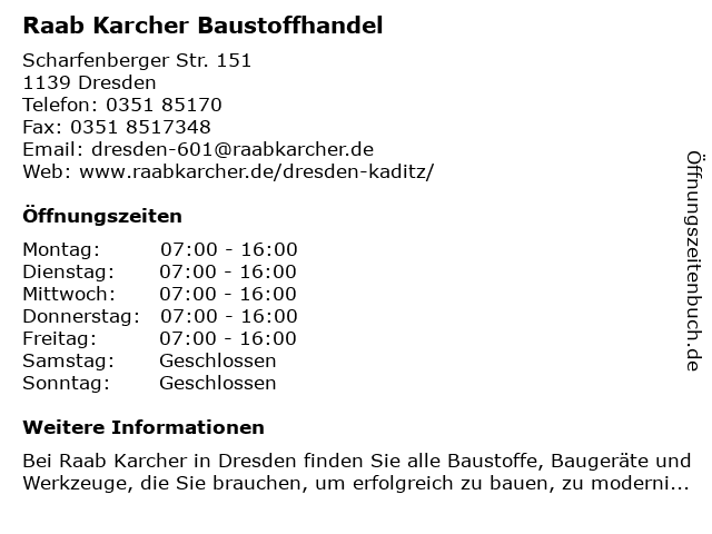 | Öffnungszeiten Raab Karcher Baustoffhandel in Dresden anzeigen | |