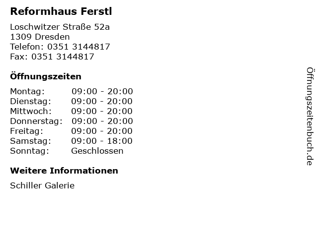 | Öffnungszeiten Reformhaus Ferstl in Dresden anzeigen | |