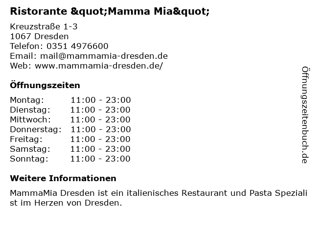 | Öffnungszeiten Ristorante "Mamma Mia" in Dresden anzeigen | |