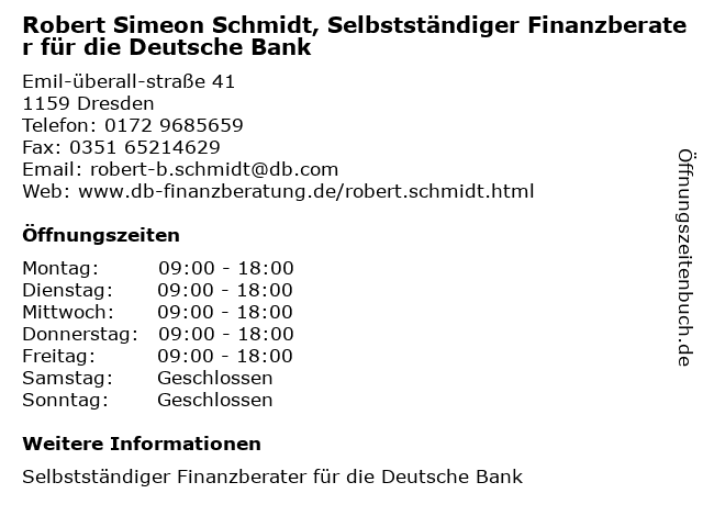 Branchen & Suchbegriffe zu Robert Simeon Schmidt, Selbstständiger Finanzberater für die Deutsche Bank:bank, deutsche, finanzberater, robert, schmidt, selbstständiger, simeon |