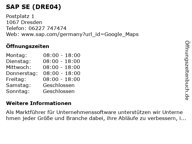 | Öffnungszeiten SAP SE (DRE04) in Dresden anzeigen | |