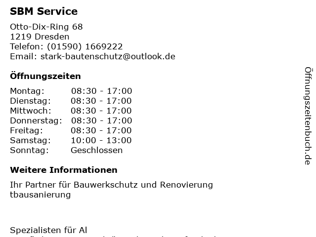 | Öffnungszeiten SBM Service in Dresden anzeigen | |