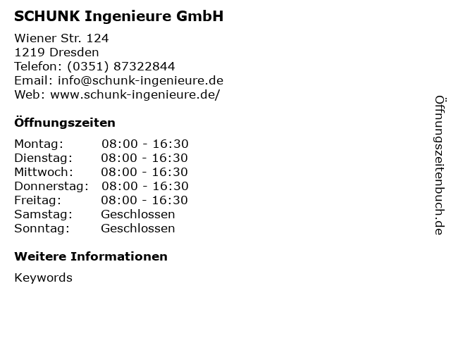 | Öffnungszeiten SCHUNK Ingenieure GmbH in Dresden anzeigen | |