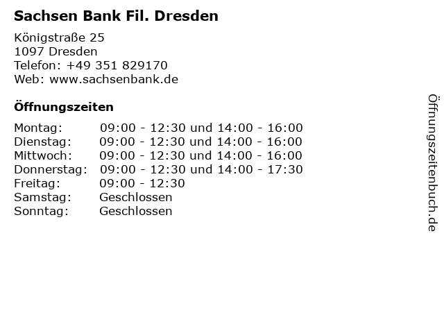 | Öffnungszeiten Sachsen Bank Fil. Dresden in Dresden anzeigen | |