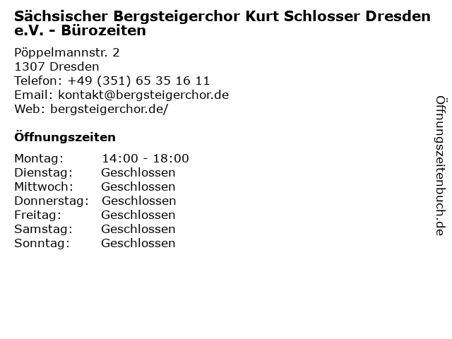 Branchen & Suchbegriffe zu Sächsischer Bergsteigerchor Kurt Schlosser Dresden e.V. - Bürozeiten:bergsteigerchor, bürozeiten, chor, e.v., kurt, musik, schlosser, sächsischer, veranstaltungen, vereine |