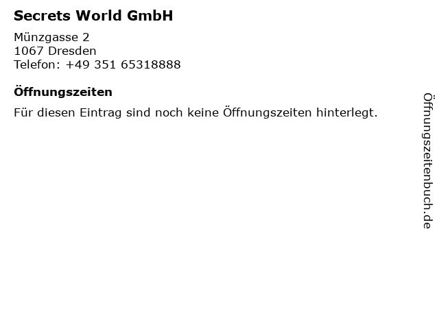 | Öffnungszeiten Secrets World GmbH in Dresden anzeigen | |