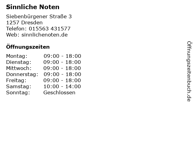 | Öffnungszeiten Sinnliche Noten in Dresden anzeigen | |