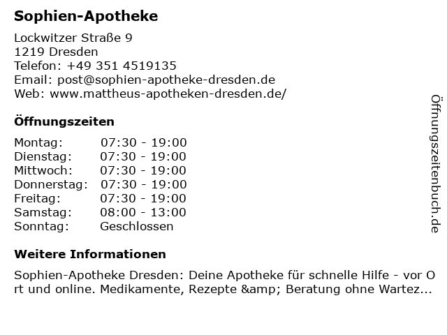 | Öffnungszeiten Sophien-Apotheke in Dresden anzeigen | |