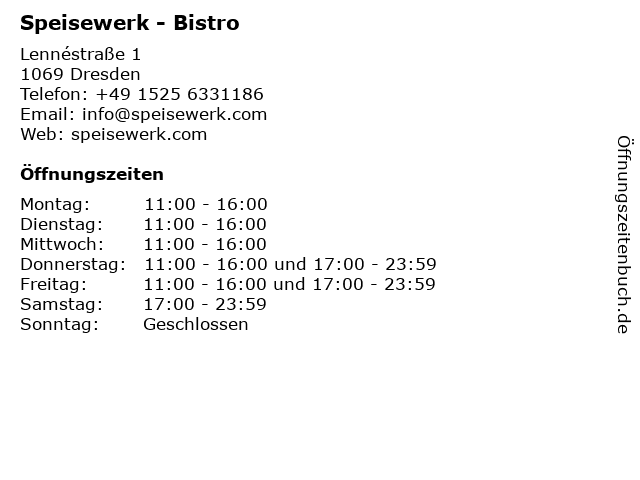 | Öffnungszeiten Speisewerk - Bistro in Dresden anzeigen | |
