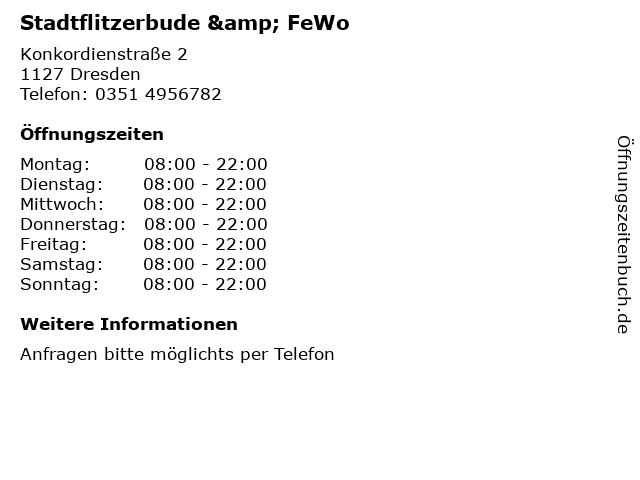 | Öffnungszeiten Stadtflitzerbude & FeWo in Dresden anzeigen | |