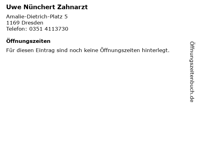 | Öffnungszeiten Uwe Nünchert Zahnarzt in Dresden anzeigen | |