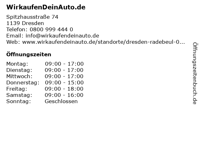 | Öffnungszeiten WirkaufenDeinAuto.de in Dresden anzeigen | |