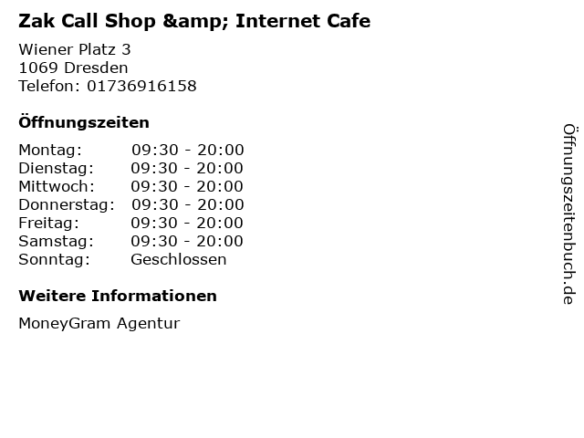 | Öffnungszeiten Zak Call Shop & Internet Cafe in Dresden anzeigen | |