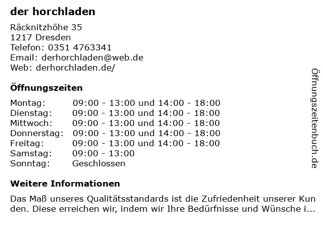| Öffnungszeiten der horchladen in Dresden anzeigen | |