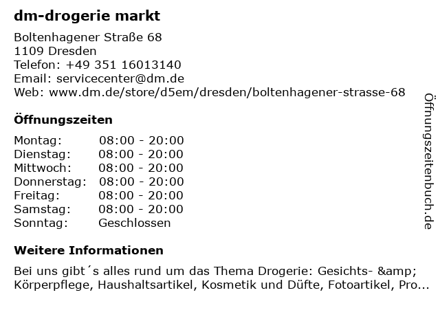 | Öffnungszeiten dm-drogerie markt in Dresden anzeigen | |