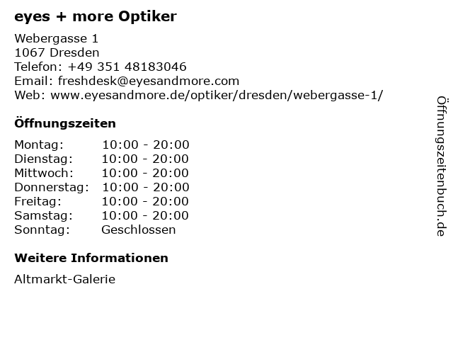 | Öffnungszeiten eyes + more Optiker in Dresden anzeigen | |