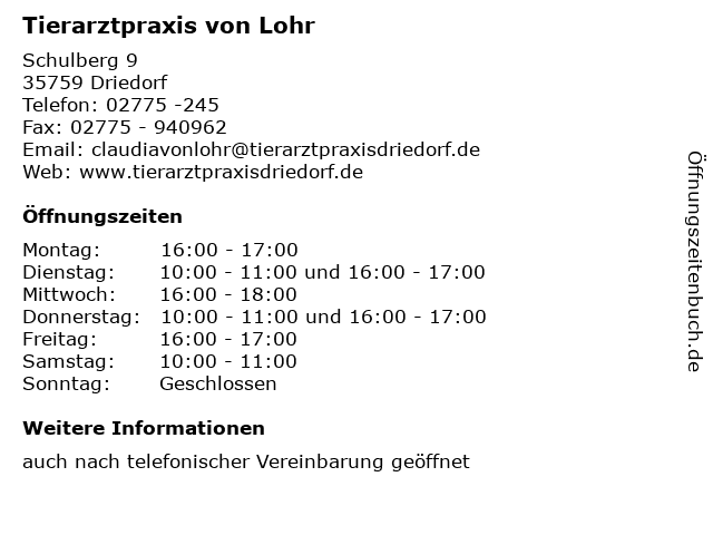 | Öffnungszeiten Tierarztpraxis von Lohr in Driedorf anzeigen | |
