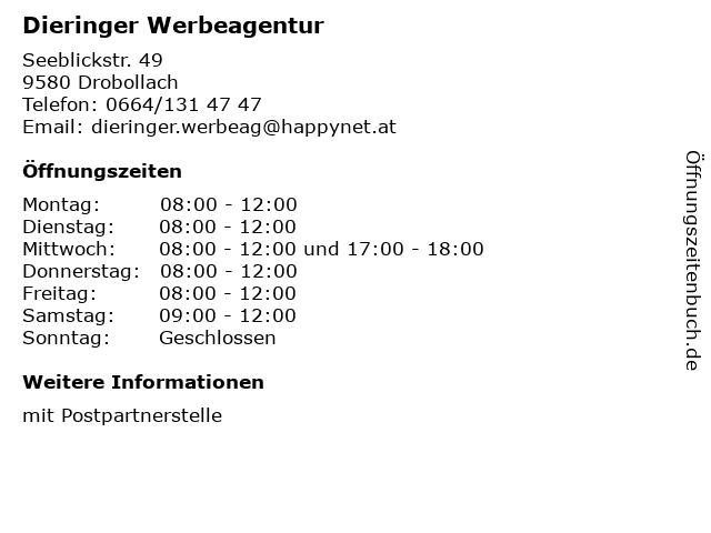 | Öffnungszeiten Dieringer Werbeagentur in Drobollach anzeigen | |
