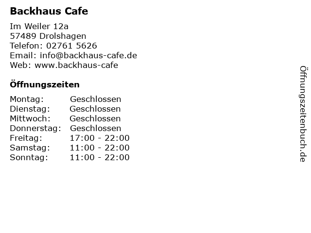 | Öffnungszeiten Backhaus Cafe in Drolshagen anzeigen | |