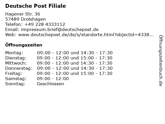 Öffnungszeiten Deutsche Post Filiale in Drolshagen anzeigen | |