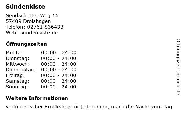 | Öffnungszeiten Sündenkiste in Drolshagen anzeigen | |