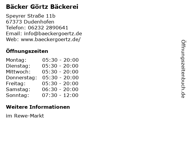 | Öffnungszeiten Bäcker Görtz Bäckerei in Dudenhofen anzeigen | |