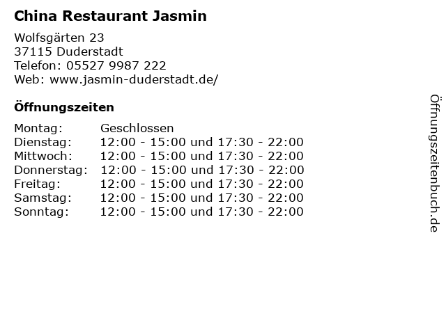 | Öffnungszeiten China Restaurant Jasmin in Duderstadt anzeigen | |