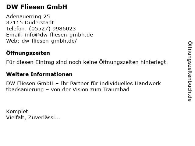 | Öffnungszeiten DW Fliesen GmbH in Duderstadt anzeigen | |