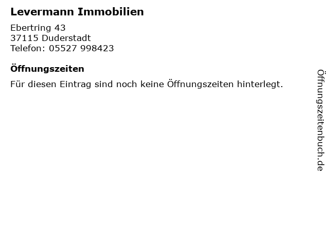 | Öffnungszeiten Levermann Immobilien in Duderstadt anzeigen | |