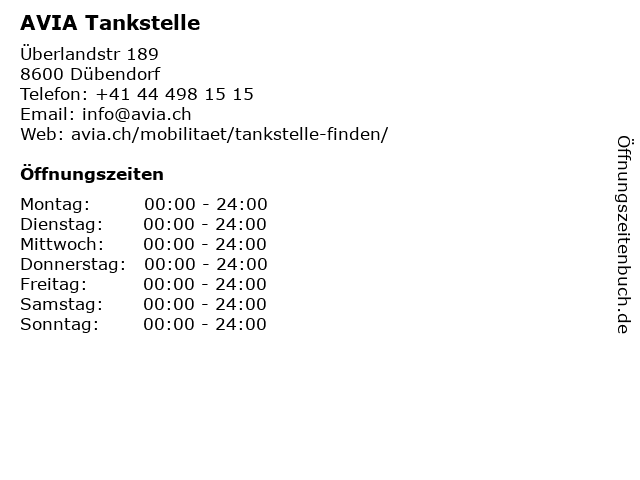 | Öffnungszeiten AVIA Tankstelle in Dübendorf anzeigen | |