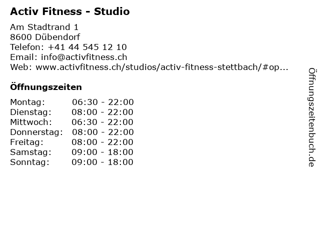 | Öffnungszeiten Activ Fitness - Studio in Dübendorf anzeigen | |