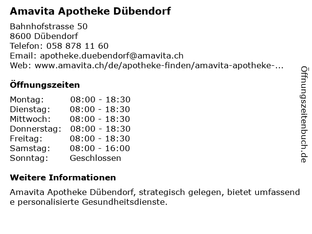 | Öffnungszeiten Amavita Apotheke Dübendorf in Dübendorf anzeigen | |
