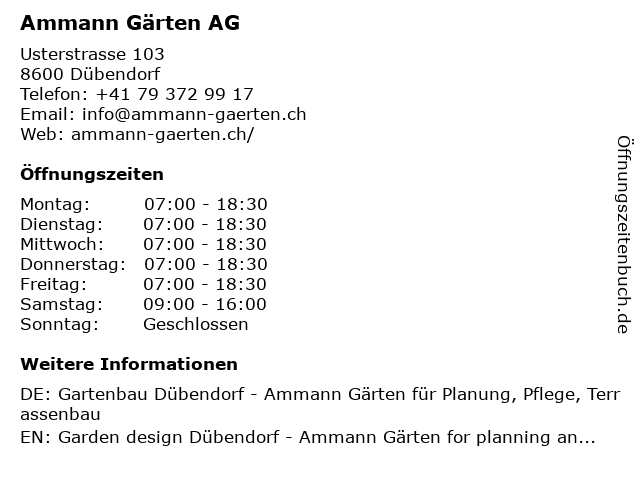 | Öffnungszeiten Ammann Gärten AG in Dübendorf anzeigen | |